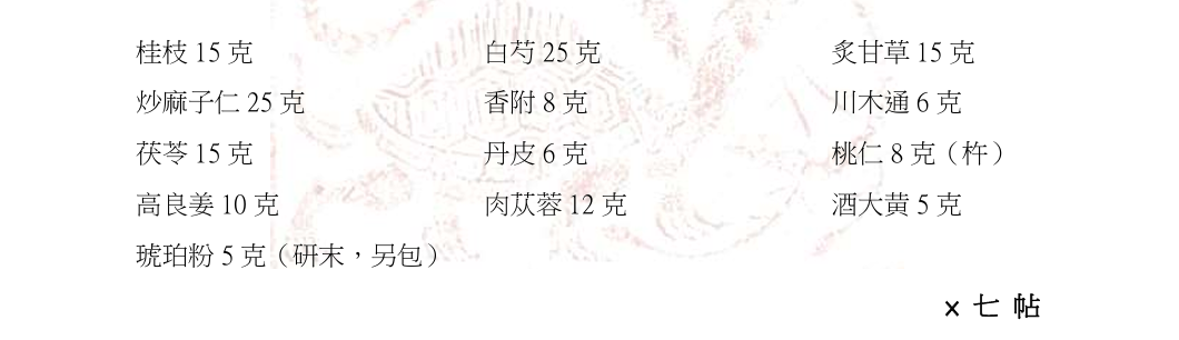 观其人:脸色黄白相间而无华,人消瘦。舌质暗红,苔薄黄。神倦怠,自述长期焦虑。问其病:汗多,怕冷。胃口尚可,但是苦于腹部胀痛不敢多食。每次腹痛,皆始于腹胀,而腹胀又源于进食,长久如此,无法正常进食,食量仅剩原来的三分之一。胀痛时,肚皮柔软,可接受按压,伴随有肠鸣声。每日排便,但无力,前段皆是粒状便排出。小便顺畅,色稍黄,每日下午3-4点最累,且一定会有浓黄色小便排出。在接受西医内照治疗后,月经随即停止。宫颈癌之后,又检查出甲状腺结节,并再次接受手术,术后恢复较好。溯其源:癌症的深层病因,必然与患者的精神状态有关。长期的负向情绪必然影响到人体清阳之气的循环,进而导致糟粕寒邪在体内的累积,最终导致了癌症。患者的宫颈癌和甲状腺结节,追根溯源,都是心病的范畴。因此,从长线治疗看,重在疏肝和养神。然而,患者当下的主述却是腹部胀痛,究其原因,是内照治疗导致了月经这一人体核心外排通道的闭合。因此,必须在月经消失的情况下,强行在人体开辟出一条新的外排通道,方能有效缓解病痛。基于上述判断,乃柔和桂枝汤、桂枝茯苓丸、良附丸,并辅以琥珀、芒硝,予下方五帖: