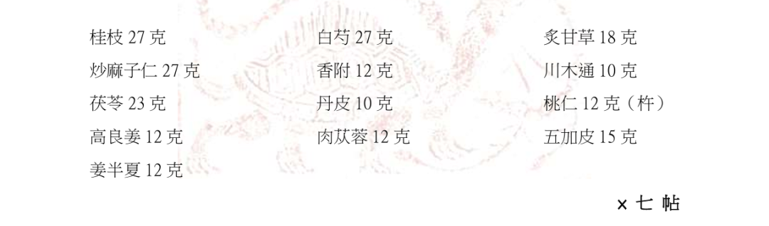 初服二三帖,状态尚可。后由于天气转冷,再次出现腹部胀痛,同时出现便血,方知病机已出现实质性松动。乃嘱其在原方基础上新加桂枝10克,元胡12克,一帖药改两日服完。服毕,状态虽未如首次用方后取得明显效果,但身体状态总体保持稳定,食量稳中有增,其中一日已与常人无异。为进一步增强药力,同时防止药量过大损伤患者本就脆弱的脾胃,遂将服药节奏改为两日服用一帖,予下方七帖,并叮嘱在天气转凉时多加10克桂枝:![]()