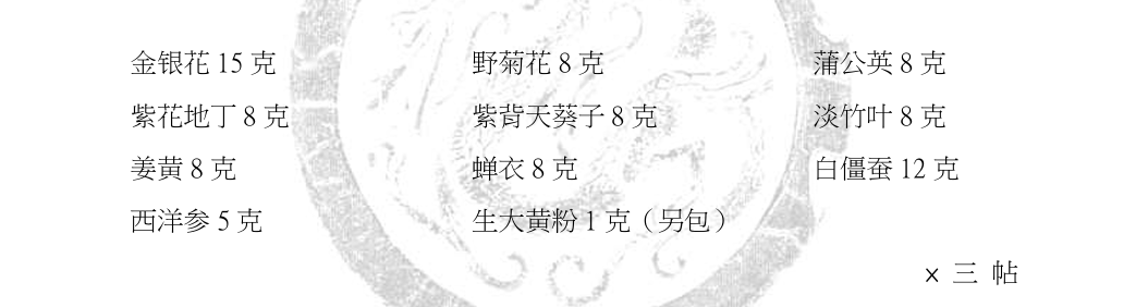 待到七月初再次联系,已暴瘦近三十斤,体力下降且失去耐力,口腔中腥臭粘液依然存在。放疗非但没有解决原有问题,还进一步导致嘴部水肿,牙龈萎缩,口腔粘且干燥,愈发难以张口,稍有拉扯即大量出血。鉴于身体状态下滑明显,已承载不起诸如五味消毒饮一类的苦寒药方,改以独取升降散,引导身体自行选上下之势排出病机,同时,辅以公英,芦根、竹沥、仙鹤草、栝楼根等,以期解毒、润燥、散结之功。